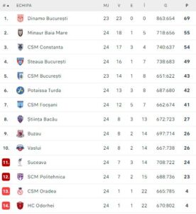 CS Minaur Baia Mare a surclasat pe CSM Focșani, scor 34-24 (16-13), în etapa 24 din Liga Zimbrilor și a urcat pe locul 2 în clasament după ce a profitat de eșecul constănțenilor în fața campioanei Dinamo București. Cu două etape înainte de finalul sezonului Minaur are 55 puncte, cu unul mai mult decât CSM Constanța.