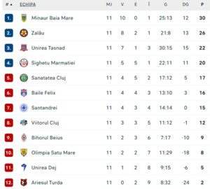 La jumătatea sezonului regulat, echipele situate pe primele patru poziții în Seria 8 din Liga 3, cele care duc în play-off, sunt CS Minaur (30 de puncte), SCM Zalău (26 p), Uniea Tășnad (22 p) și CSM Sighetu Marmației (20 p).
